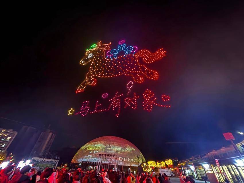千架无人机光影秀。南江县委宣传部供图2026丙午马年新春,四川南江断渠文化产业园以“骏影迎春・幻享中国年”为主题,深度融合米仓古道文化底蕴与现代沉浸式文旅体验,为广大市民与游客献上一场年味十足、创意满满的新春文旅盛宴。2月16日除夕夜,园区活动迎来最高潮,光影璀璨、歌舞欢腾、传统与潮流激情碰撞,一场视听狂欢让现场观众直呼“过瘾”,从午后至深夜,整座断渠沉浸在喜庆祥和的新春氛围之中。
